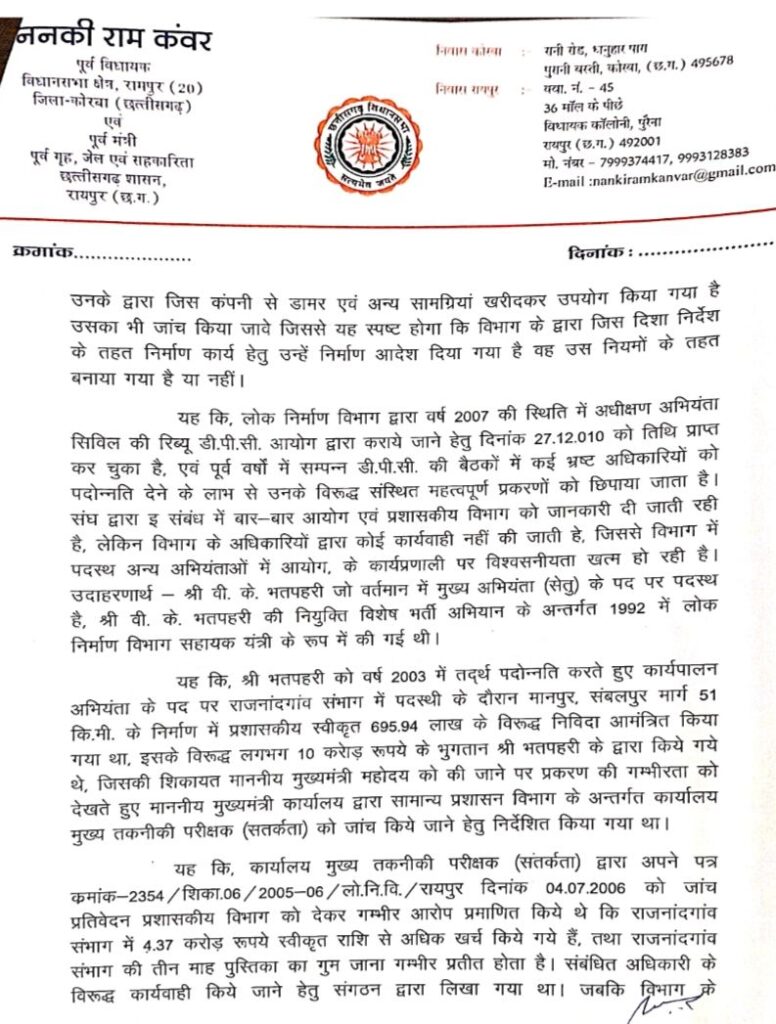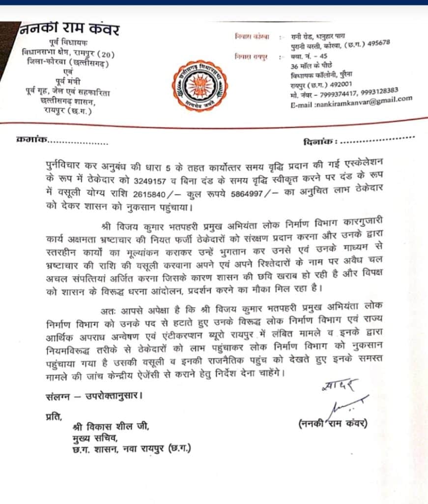 छत्तीसगढ़ के पूर्व गृह मंत्री एवं वरिष्ठ भाजपा नेता ननकी राम कंवर की एक चिट्ठी ने राज्य की प्रशासनिक और राजनीतिक हलकों में हलचल मचा दी है। कंवर ने राज्य के मुख्य सचिव विकासशील को पत्र लिखकर लोक निर्माण विभाग (PWD) के मुख्य अभियंता विजय कुमार भतपहरी पर गंभीर भ्रष्टाचार के आरोप लगाए हैं और पूरे मामले की सीबीआई जांच कराने की मांग की है।