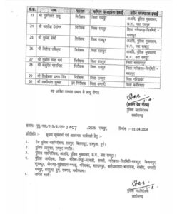 रायपुर (छत्तीसगढ़ उजाला)। छत्तीसगढ़ में पुलिस विभाग में एक बड़ा प्रशासनिक बदलाव किया गया है। पुलिस मुख्यालय ने राज्यभर में तैनात अधिकारियों के तबादले के आदेश जारी किए हैं, जिसके तहत कुल 30 पुलिसकर्मियों को नई जिम्मेदारियां सौंपी गई हैं। जारी सूची के अनुसार इस फेरबदल में 29 निरीक्षक स्तर के अधिकारी और एक उप निरीक्षक शामिल हैं।