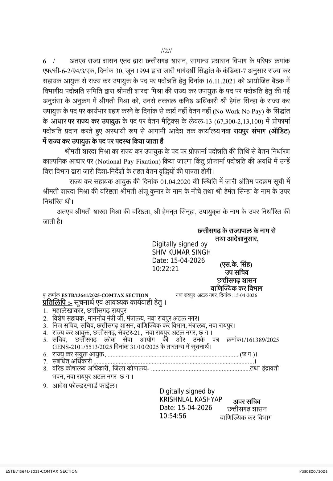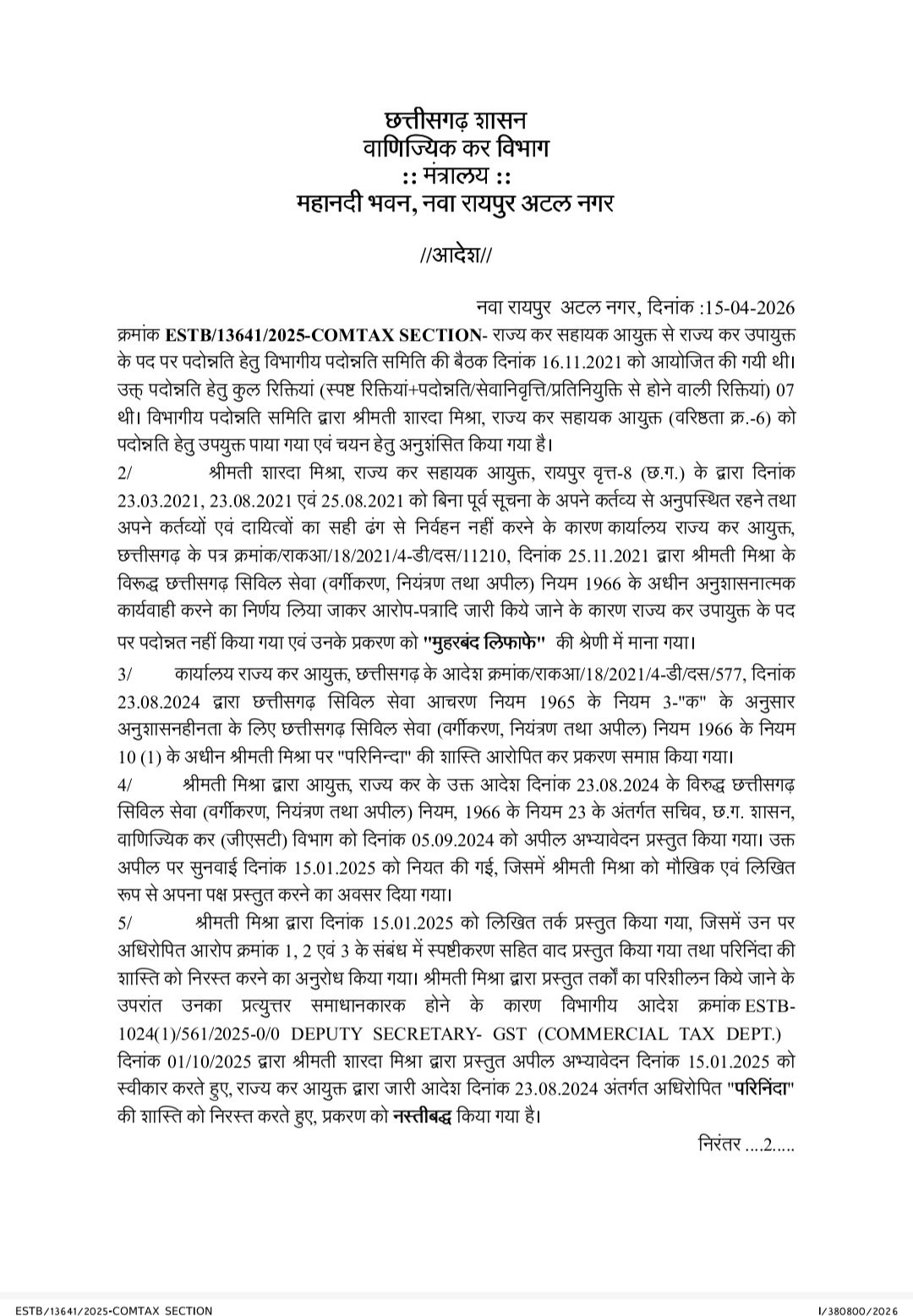 रायपुर(छत्तीसगढ़ उजाला)-छत्तीसगढ़ के वाणिज्यिक कर (GST) विभाग ने प्रशासनिक स्तर पर बड़ा और रणनीतिक फैसला लेते हुए अनुभवी अधिकारी श्रीमती शारदा मिश्रा को डिप्टी कमिश्नर पद पर पदोन्नत किया है। पदोन्नति के साथ ही उन्हें नया रायपुर (अटल नगर) डिवीज़न के सबसे संवेदनशील और हाई-प्रोफाइल ऑडिट की जिम्मेदारी सौंपी गई है, जिसे विभाग की रीढ़ माना जाता है।